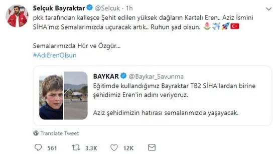 Bayraktar, resmi Twitter hesabından yaptığı paylaşımda, "pkk tarafından kalleşce Şehit edilen yüksek dağların Kartalı Eren.. Aziz İsmini SİHA'mız Semalarımızda uçuracak artık.. Ruhun şad olsun. ?✈???Semalarımızda Hür ve Özgür... #AdıErenOlsun " ifadelerini kullandı.