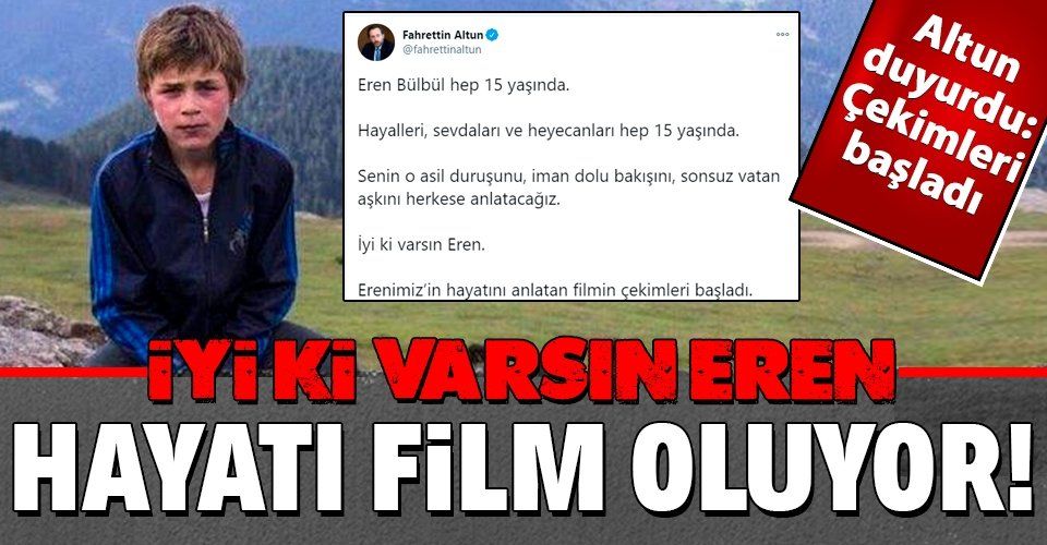Eren Bülbül'ün hayatını anlatan filmin başladığını bildiren Altun, "Eren Bülbül hep 15 yaşında. Hayalleri, sevdaları ve heyecanları hep 15 yaşında. Senin o asil duruşunu, iman dolu bakışını, sonsuz vatan aşkını herkese anlatacağız. İyi ki varsın Eren. Erenimiz'in hayatını anlatan filmin çekimleri başladı" ifadelerini kullandı.