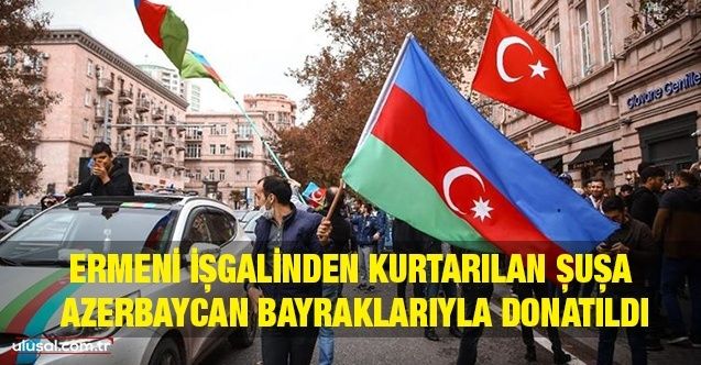28 yıl sonra Ermenistan’ın işgalinden kurtarılan Şuşa kentinde Azerbaycan bayrakları dalgalandırıldı. Karabağ’ın kurtarılmasında kritik öneme sahip kentin dört bir yanı Azerbaycan bayraklarıyla donatıldı.