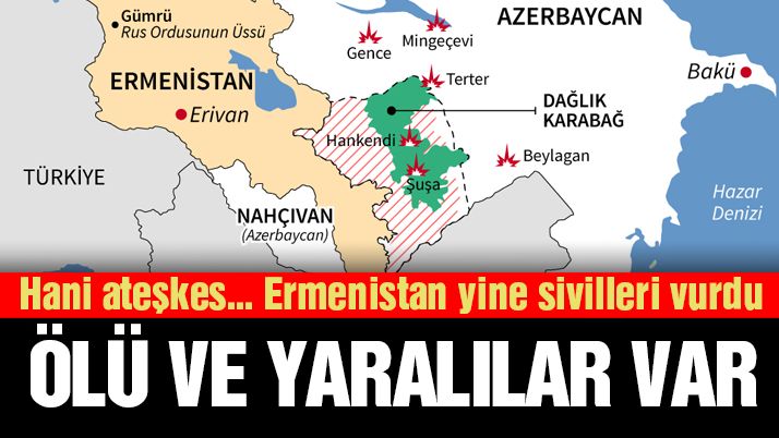 Azerbaycan ve Ermenistan arasında haftalardır devam eden gerilim Rusya’nın arabuluculuğu ile sağlanan ateşkes anlaşmasına gölge düşürmeye devam ediyor… Ateşkesten hemen sonra Azerbaycan’ın en büyük kenti Gence’yi vuran Ermeni ordusu bugün de Terter’de mezarlık ziyaretinde bulunan sivilleri vurdu.