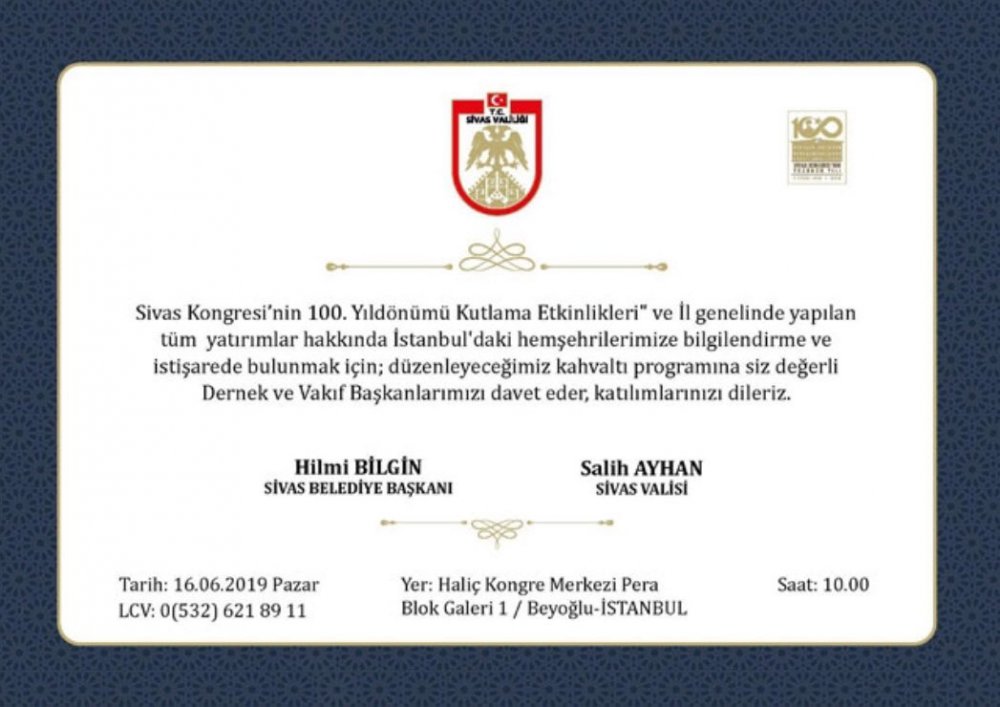 Vali ve belediye başkanı imzalı davetiyede "Sivas Kongresi'nin 100. Yıldönümü Kutlama Etkinlikleri ve İl genelinde yapılan tüm yatırımlar hakkında İstanbul'daki hemşehrilerimize bilgilendirme ve istişarede bulunmak için; düzenleyeceğimiz kahvaltı programına siz değerli Dernek ve Vakıf Başkanlarımızı davet eder, katılımlarınızı dileriz." ifadeleri kullanıldı.