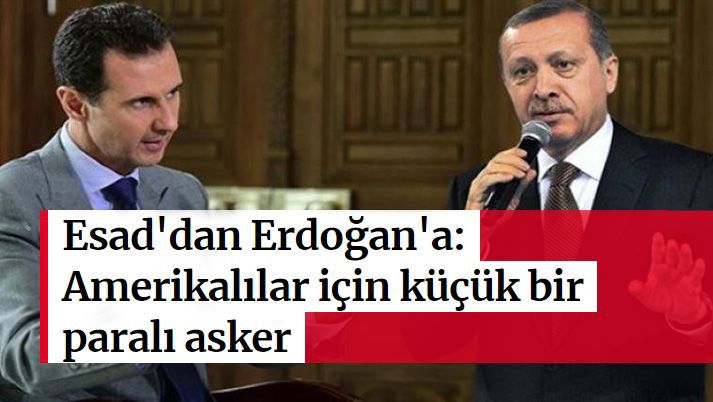 BBC İzleme Servisi'nin haberine göre Esad, "Müslüman Kardeşler'in Erdoğan'ı, olayların arkasında kendisi varmış gibi gözükmeye çalışıyor. Sinirlendiği zaman 'Sabrımız kalmadı' gibi tehditler savuruyor. Aman ne büyük sorun! Erdoğan aslında Amerikalılar için küçük bir paralı asker" dedi.