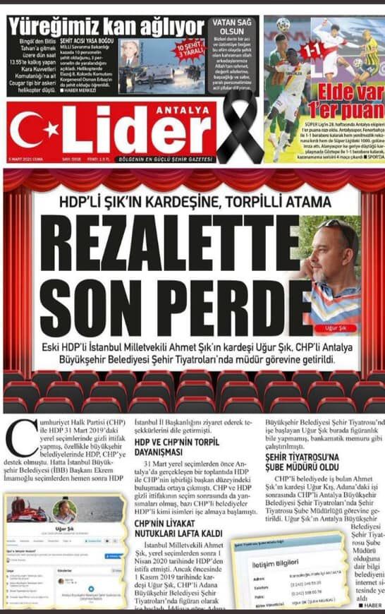 HDP İstanbul Milletvekili Ahmet Şık, yerel seçimlerden sonra 1 Nisan 2020 tarihinde HDP'den istifa etmişti. Ancak öncesinde 1 Kasım 2019 tarihinde kardeşi Uğur Şık, CHP'li Adana Büyükşehir Belediyesi Şehir Tiyatroları'nda figüran olarak işe başladı.
