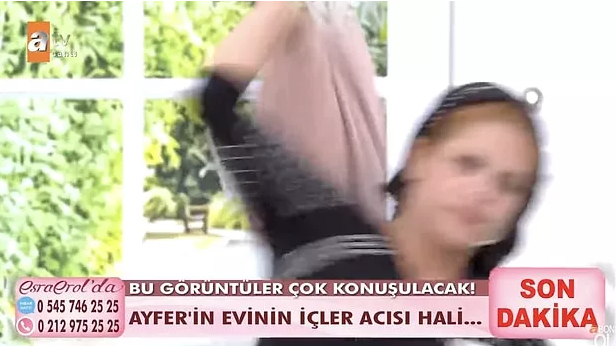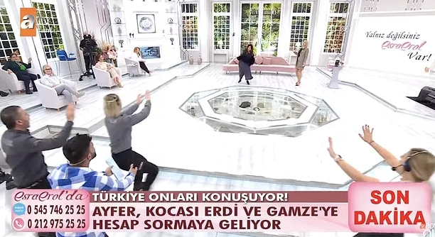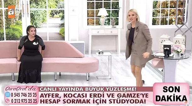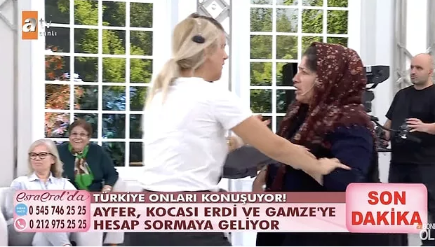 Yalnızca Nergiz Hanım değil, eşi Erdi ve Gamze'ye hesap sormak için stüdyoya gelen Ayfer de sinirlerine hakim olamadı. Erdi'nin sözleri ve tavırları karşısında kendisine mukayyet olamayan Ayfer, oturduğu koltuktaki yastığı Erdi'ye fırlattı.