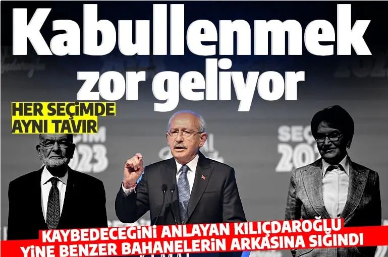 CHP Genel Başkanı Kılıçdaroğlu, Cumhurbaşkanı Recep Tayyip Erdoğan karşısında aldığı her seçim yenilgisi sonrası, kamuoyunun ezberlediği benzer bahanelerin ardına saklandı.14 Mayıs 2023 Cumhurbaşkanlığı ve Genel Seçimleri sonrası kameraların karşısına geçen Kemal Kılıçdaroğlu, "Erdoğan toplumdan beklediği güvenoyunu alamamıştır" açıklamasını yaptı.