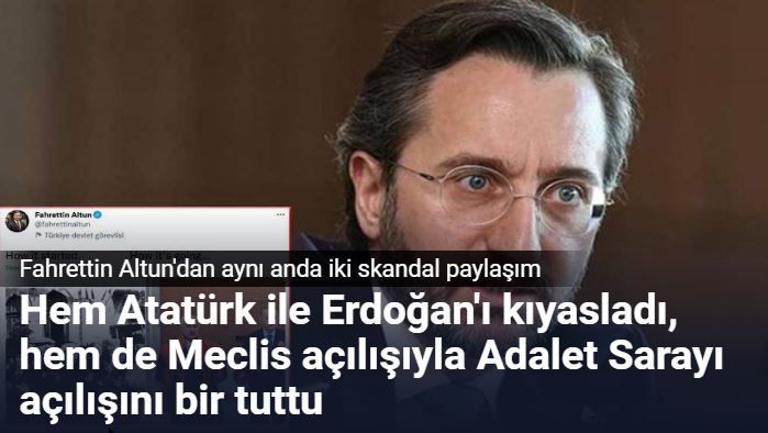 Altun, sosyal medya hesabından Mustafa Kemal'in (O zaman henüz Atatürk soyadını almamıştı) 23 Nisan 1920'de Meclis'in açıldığı gün dua etme fotoğrafını paylaştı. İkinci fotoğrafta ise AKP’li Cumhurbaşkanı Erdoğan, Yargıtay Başkanı Mehmet Akarca ve Diyanet İşleri Başkanı Ali Erbaş dua ediyor.