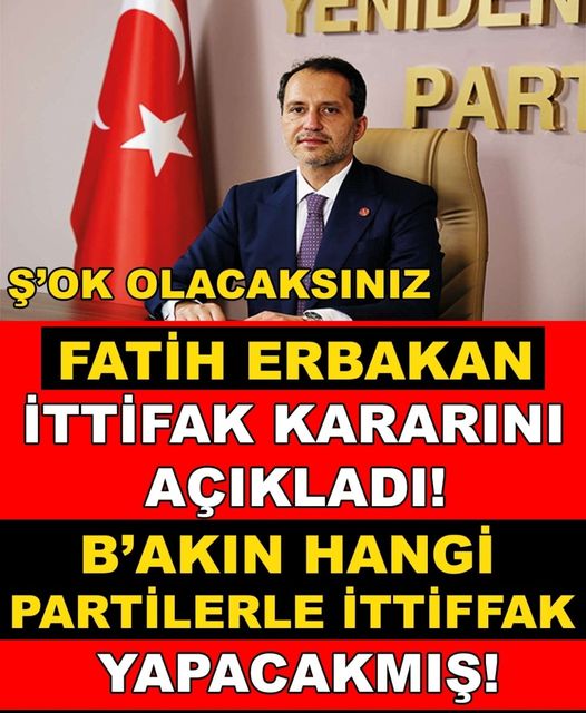 Gelin milli görüş çatısı altında ittifak kuralım” dedi.Yeniden Refah Partisi Genel Başkanı Fatih Erbakan, Antalya’nın Kemer ilçesindeki bir otelde düzenlenen partisinin il diğernları toplantısında konuştuHP, İYİ Parti, Saadet Partisi, Gelecek Partisi, Demokrat Parti ve DEVA Partisi’nin ortak çalışmasını eleştiren Erbakan, bu mutabakatta CHP Genel Başkanı Kemal Kılıçdaroğlu’nun cumhurbaşkanı olma planı bulunduğunu öne sürdü.”O masadaki CHP dışındaki partilere davette bulunuyoruz” diyen Erbakan, “Bütün bu hatalılarınızdan ve hatalı pozisyonunuzdan dönün. Gelin milli görüş çatısı altında ittifak kuralım.