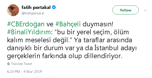 AKP’nin İstanbul Büyükşehir Belediye Başkanı adayı Binali Yıldırım “bu bir yerel seçim, ölüm kalım meselesi değil” dedi. Gazeteci Fatih Portakal’dan Yıldırım’a uyarı geldi; “Aman Erdoğan ve Bahçeli duymasın.”
