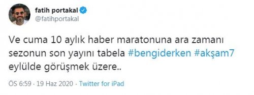 Fox Ana Haber'in sunucusu gazeteci Fatih Portakal'ın veda açıklaması izleyenleri şaşırttı. Portakal, izleyenlere Eylül ayından yeniden ekranlarda olacağını müjdeledi. Gazeteci ve Fox Ana Haber sunucusu Fatih Portakal, dün akşamki haber bülteninde yaptığı veda konuşması ile izleyenleri şaşırtırken, bir süre ekranlara ara vereceğini ifade eden Portakal, Eylül ayında yine Fox Tv ekranlarında olacağını belirtti