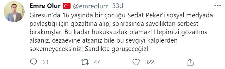 Organize suç örgütü lideri Sedat Peker'e yakınlığı ile bilinen Basın Danışma Emre Olur, sosyal medyada yaptığı açıklamada 16 yaşındaki bir gencin Sedat Peker'i paylaşması nedeniyle gözaltına alındığını iddia etti.