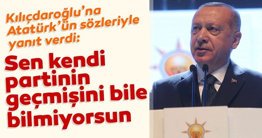 Erdoğan, CHP'nin kurucu Gazi Mustafa Kemal Atatürk'ün sözlerini hatırlattı, "Sen kendi partinin geçmişinden bir habersin" dedi.Erdoğan, "Sen kendi geçmişini bile bilmiyorsun. İkide bir bu partinin kurucusu Gazi Mustafa Kemal Atatürk'tür diyorsun. Gazi Mustafa Kemal ne diyordu, 'Ben size ölmeyi emrediyorum'. Sen kendi partinin geçmişinden bile bir habersin. Biz bu mücadeleyi bundan sonra da vermeye devam edeceğiz Bay Kemal. Sen şehitliği bilmezsin. Sen şehitliği anlamazsın. Sende o iman da yok." diye konuştu.
