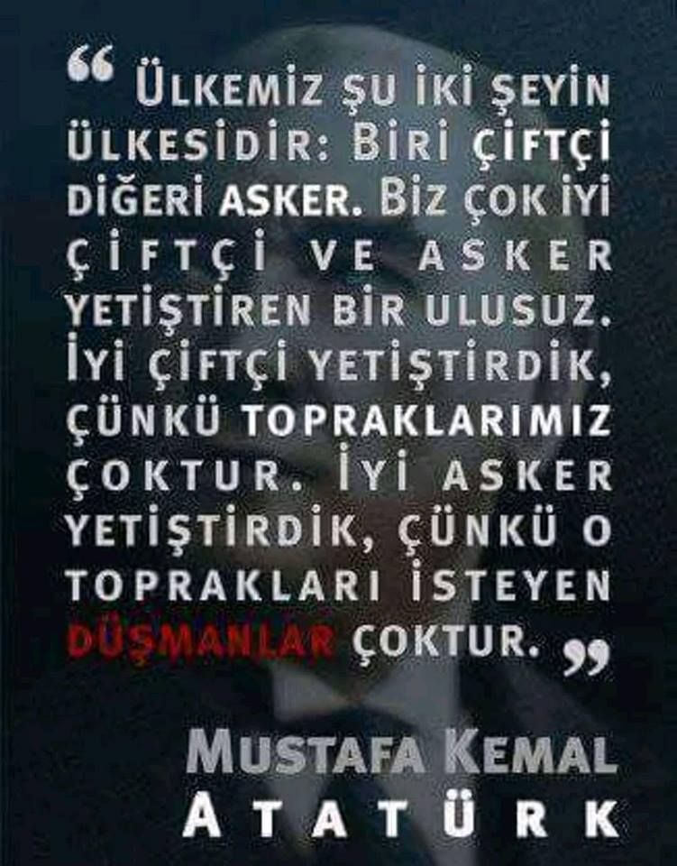 Memleketimiz, şu iki şeyin memleketidir: Biri çiftçi, diğeri asker. Biz çok iyi çiftçi ve çok iyi asker yetiştiren bir milletiz. İyi çiftçi yetiştirdik; çünkü topraklarımız çoktur. İyi asker yetiştirdik; çünkü o topraklara göz diken düşmanlar fazladır. O toprakları sürenler, o toprakları koruyan, hep sizlersiniz. Bundan sonra da daha iyi çiftçi ve daha iyi asker olacağız. Ama bundan sonra asker oluşumuz, artık eskisi gibi başkalarının tutkusu, şan ve şöhreti, keyfi için değil, yalnız ve yalnız bu aziz topraklarımızı korumak içindir.