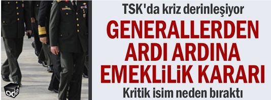 Çok sayıda generalin emeklilik dilekçesi verdiği öğrenilirken Tümgeneral Ahmet Ercan Çorbacı, Tuğgeneraller Ömer Faruk Bozdemir, Uğur Bülend Acarbay, Recep Özdemir ve Ertuğrul Sağlam diğer isimler. Söz konusu generaller dışında başka emeklilik taleplerinin de olduğu önümüzdeki günlerde tablonun netleşeceği öğrenildi.