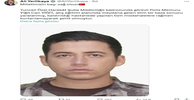 İçişleri Bakanı Ali Yerlikaya, sosyal medya hesabı X üzerinden yaptığı açıklamayla Tunceli’den gelen acı haberi duyurdu.Tunceli Özel Harekat Şube Müdürlüğü’nde görev yapan Polis Memuru Yiğit Can Yiğit, atış eğitimi alanında meydana gelen kaza sonucu yaralandı. Hastaneye kaldırılan Yiğit, yapılan tüm müdahalelere rağmen kurtarılamayarak şehit oldu.Bakan Yerlikaya yaptığı paylaşımda şu ifadelere yer verdi: Milletimizin başı sağ olsun. Şehidimize Allah’tan rahmet; kederli ailesine, kahraman Emniyet Teşkilatımıza ve Milletimize başsağlığı diliyorum. Makamı âli olsun.