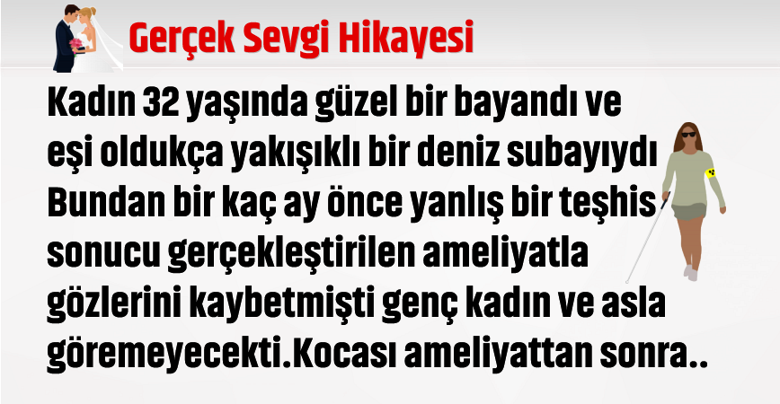 Kadın 32 yaşında güzel bir bayandı ve eşi oldukça yakışıklı bir deniz subayıydı Bundan bir kaç ay önce yanlış bir teşhis sonucu gerçekleştirilen ameliyatla gözlerini kaybetmişti genç kadın ve asla göremeyecekti. Kocası ameliyattan sonra acı gerçeği öğrenince yıkılmış ve kendi kendine bir söz vermişti. Günler geçiyordu kadın her geçen gün kendini daha kötü hissediyor, çok sevdiği kocasına yük olduğunu düşünüyordu. Eşinin bu içine kapanık, karamsar hali kocayı çok üzüyordu."DEVAM ETMEK GÖRSELE TIKLAYARAK İLERLEYİNİZ..