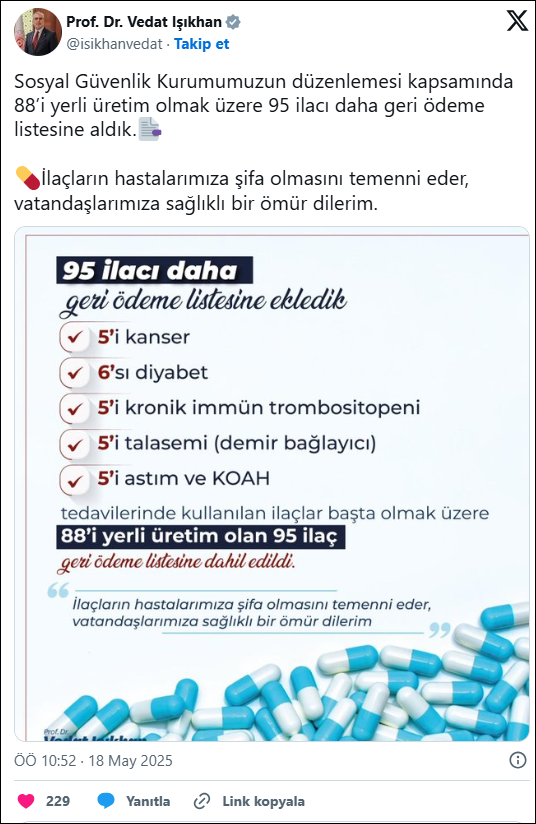 Bakan Işıkhan, sosyal medya hesabı üzerinden yaptığı duyuruda, "Sosyal Güvenlik Kurumumuzun düzenlemesi kapsamında, 88’i yerli üretim olmak üzere 95 ilaç daha geri ödeme listesine alınmıştır. Vatandaşlarımıza hayırlı olsun" ifadelerini kullandı.