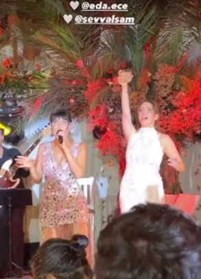 ŞEVVAL SAM SAHNEYE ÇIKTI Eda Ece'nin "Yasak Elma" dizisindeki rol arkadaşı ve yakın dostu Şevval Sam da sahneye çıkarak şarkılar söyledi.