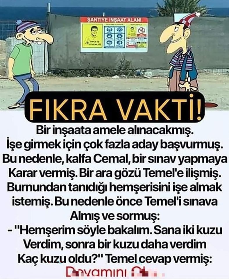 Bir inşaata amele alınacaktır. Alınacak elemanları kalfa Cemal in seçmesi istenir. Adaylar kalabalıktır. Bu durumda Cemal sınav yapmaya karar verir.