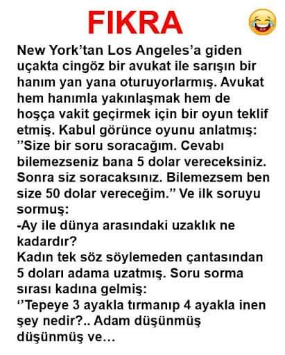 Uçakta cingöz bir avukat sormuş Sonuna çok güleceksiniz... New York’tan Los Angeles’a giden uçakta cingöz bir avukat ile sarışın bir hanım yan yana oturuyorlarmış. Avukat hem hanımla yakınlaşmak hem de hoşça vakit geçirmek için bir oyun teklif etmiş. Kabul görünce oyunu anlatmış: ’’Size bir soru soracağım. Cevabı bilemezseniz bana 5 dolar vereceksiniz. Sonra siz soracaksınız. Bilemezsem ben size 50 dolar vereceğim.’’ Ve ilk soruyu sormuş: