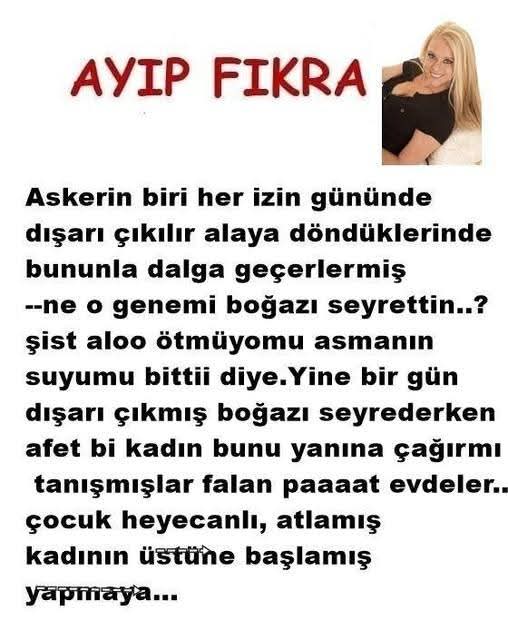 Kadın kocası isteyken sevgilisini eve çağırıyor, ikisi yatakta z-ev-k dolu saatler geçirirken aniden kapı çalıyor bir de bakıyorlar KOCASI EVE ERKEN GELMIIIIIS!!!… Kadın panik amacıylade: “Allahım bu nerden çıktı simdi!!! Çabuk al topla kıyafetlerini, camdan atla kaybol!!” Adam pencereden aşağıya bir bakıyor: “Hayır atlayamam deli misin nasıl yağmur yağıyor görmüyor musun!!!” Kadın deli gibi koşturuyor: “