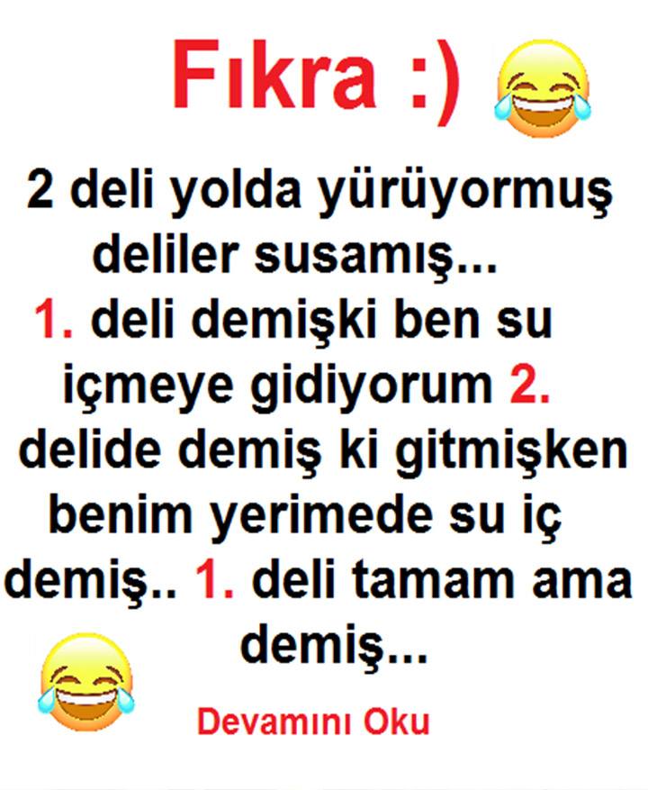 .İki deli yolda gidiyormuş. 1. Deliben susadım demiş. 2. Deli bende susadım demiş. Gitmişken benim yerimede iç demiş. 1. Deli gitmiş.10 15 dakika sonra geri gelmiş ve kendi yerime temiz su içtim senin yerin ise tuvaletten pis su içttim demiş.