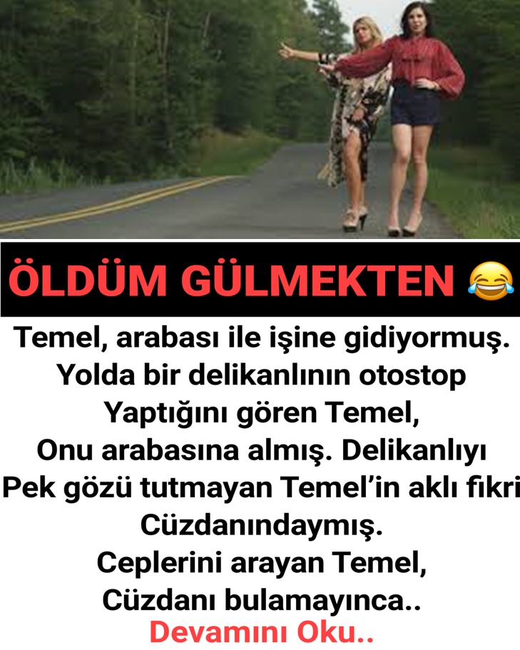 Gülmekten geberdim…)Temel, arabası ile işine gidiyormuş. Yolda bir delikanlının otostop yaptığını gören Temel, onu arabasına almış. Delikanlıyı pek gözü tutmayan Temel’in aklı fikri cüzdanındaymış.
