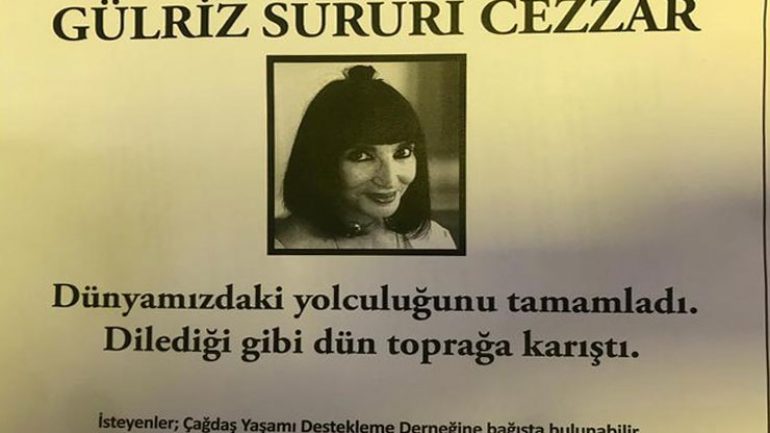 Tedavi gördüğü hastanede dün hayatını kaybeden Gülriz Sururi, bugün vasiyeti gereği sessiz sedasız toprağa verildi.