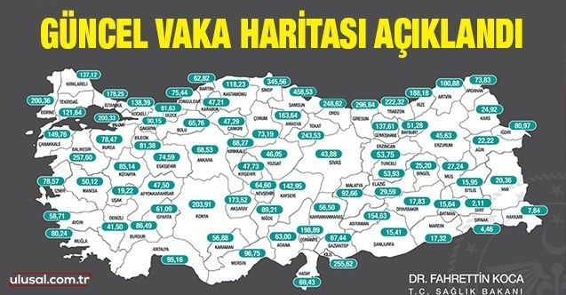 Sağlık Bakanı Fahrettin Koca, 612 Mart haftasında illere göre 100 bin kişiye düşen Kovid19 vaka sayısının güncel haritasını paylaştı.