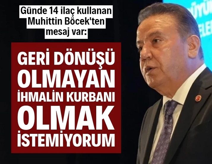 - "Sevgili hemşehrilerim, sağlığımla ilgili günde 14 ilaç kullanıyorum. Geri dönüşü olmayan ihmalin kurbanı olmak istemiyorum. Ben 6 defa belediye başkanı seçilen tek kişiyim. Muhittin Mustafa Böcek Anadolu Lisesi Antalya'da 1. sırada hayırseveriyim. Antalya'mda yaşayan tüm vatandaşlarımın huzuru, mutluluğu için gece gündüz çalıştım.