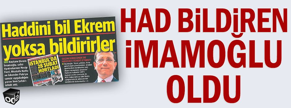 İktidara yakın Yeni Şafak gazetesi bugün sürmanşetinde İstanbul Büyükşehir Belediye (İBB) Başkanı Ekrem İmamoğlu’nu hedef alarak, “Haddini bil Ekrem yoksa bildirirler” diye başlık attı.