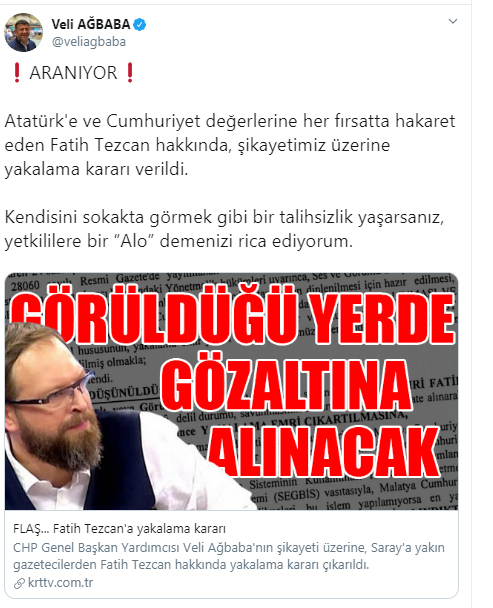 Atatürk ve Cumhuriyet ile ilgili provokatif söylemleriyle tepki çeken Saray'a yakın gazeteci Fatih Tezcan'a CHP Genel Başkan Yardımcısı Veli Ağbaba'ya hakaret ettiği gerekçesiyle yürütülen soruşturmada yakalama kararı çıkarıldı.