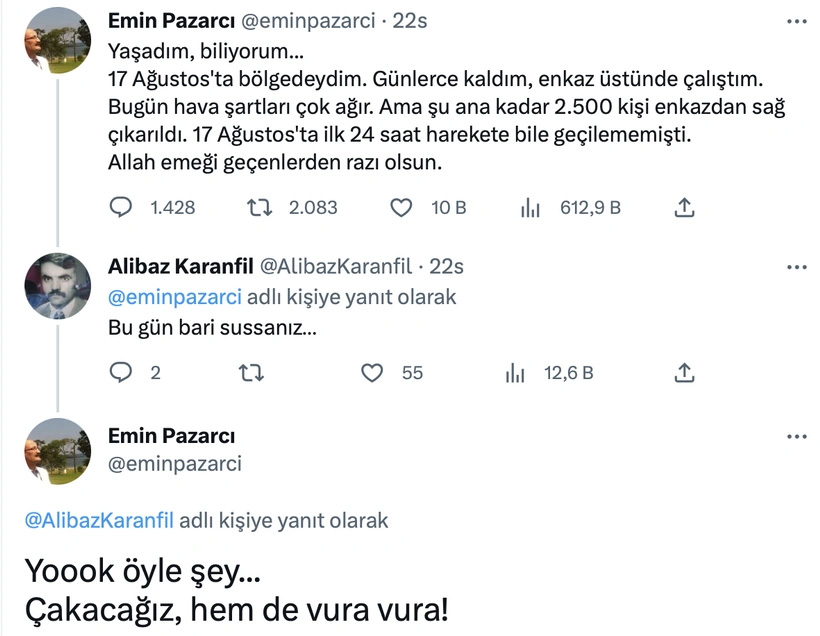 “Yaşadım, biliyorum...17 Ağustos'ta bölgedeydim. Günlerce kaldım, enkaz üstünde çalıştım.Bugün hava şartları çok ağır. Ama şu ana kadar 2.500 kişi enkazdan sağ çıkarıldı. 17 Ağustos'ta ilk 24 saat harekete bile geçilememişti. Allah emeği geçenlerden razı olsun” diye yazan Pazarcı’ya bir Twitter kullancısı “Bugün bari sussanız…” diye yanıt verdi.