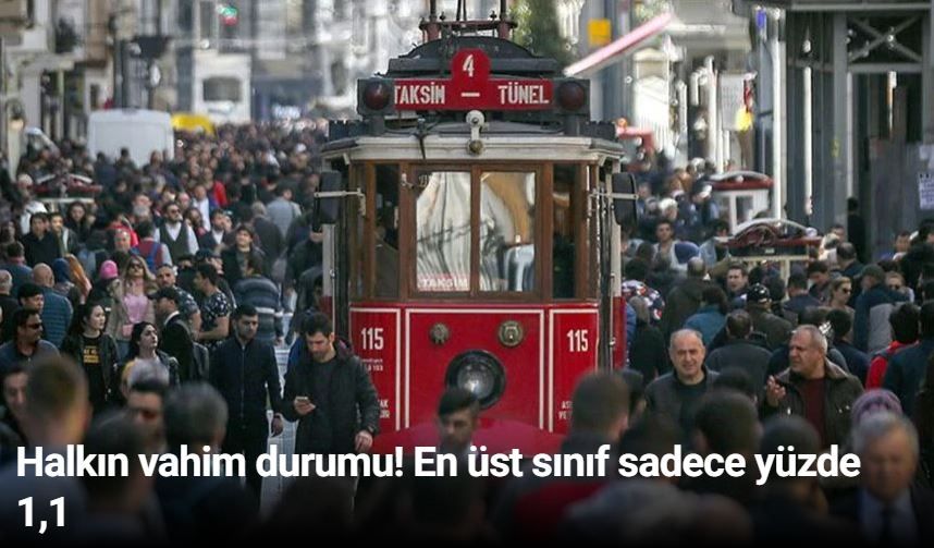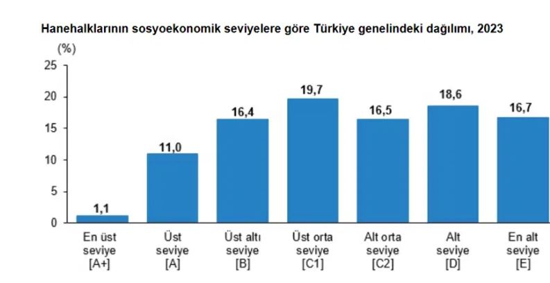 Araştırmaya göre Türkiye’de hanelerin yalnızca yüzde 1,1’i en üst sosyoekonomik seviyede bulunuyor. Hanelerin yüzde 11’i üst seviyede, yüzde 16,4’ü üst altı seviyede, yüzde 19,7’si üst orta seviyede, yüzde 16,5’i alt orta seviyede, yüzde 18,6’sı alt seviyede ve yüzde 16,7’si ise en alt seviyede yer alıyor.