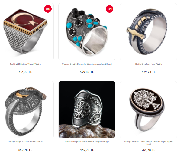 TRT Market’te Diriliş Ertuğrul Yüzüğü, Diriliş Ertuğrul Kılıcı kravat iğnesi, zarf açacağı, yüzükler, kupalar da satılıyor.