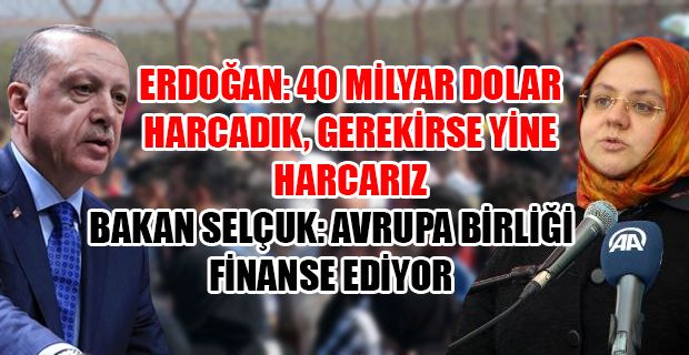 ANKA'da yer alan habere göre; Cumhurbaşkanı Recep Tayyip Erdoğan, mültecilere yapılan yardımla ilgili “40 milyar doları bu işte harcayan Türkiye evelallah bir 40 daha harcar” dedi. Aile, Çalışma ve Sosyal Hizmetler Bakanı Zehra Zümrüt Selçuk ise yardımların Avrupa Birliği (AB) tarafından finanse edildiğini belirterek, “Söz konusu yardımlar uygulanırken kendi vatandaşlarımıza ayırdığımız mali kaynakların kullanımı söz konusu değildir” açıklamasını yaptı. Bakan Selçuk, kampta kalan mültecilere kişi başı 120 lira yardım edildiğini, kamp dışındakilerin sadece çocuklarına 45 lira ile 75 lira arasında yardım verildiğini duyurdu.