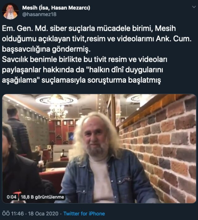2000'li yılların başında kendisini 'Mesih' ilan eden eski Refah Partisi İstanbul Milletvekili Hasan Mezarcı, kişisel Twitter hesabında savcılığın kendisi hakkında soruşturma başlattığını duyurdu.