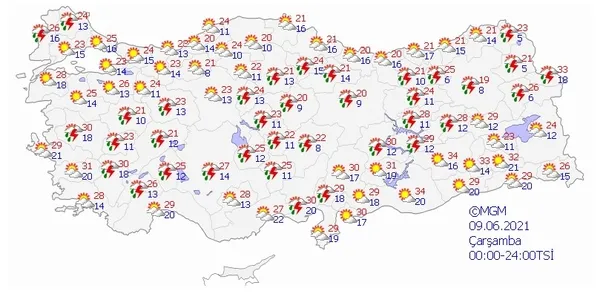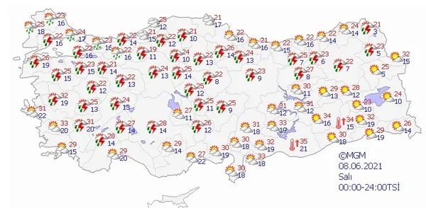 Meteoroloji Genel Müdürlüğü tarafından yapılan son değerlendirmelere göre: Ülkemizin kuzey kesimlerinin parçalı, yer yer çok bulutlu, Doğu Karadeniz, Doğu Anadolu'nun kuzeyi ve Tokat çevreleri ile Ordu'nun iç kesimlerinin yerel olmak üzere sağanak ve gök gürültülü sağanak yağışlı, diğer yerlerin az bulutlu ve açık geçeceği tahmin ediliyor. HAVA SICAKLIĞI: Sıcaklıkların kuzey ve iç kesimlerde mevsim normallerinin 24 derece altında, diğer yerlerde mevsim normalleri civarında olması beklenmektedir. RÜZGAR: Genellikle kuzey ve kuzeybatı, güneydoğu kesimlerde batı ve güneybatılı yönlerden hafif, ara sıra orta kuvvette, Doğu Anadolu'nun güneydoğusunda güneyli yönlerden yer yer kuvvetli (4060 km/sa) esmesi bekleniyor. KUVVETLİ RÜZGAR UYARISI: Rüzgarın; Doğu Anadolu'nun güneydoğusunda güneyli yönlerden yer yer kuvvetli (4060 km/sa) esmesi beklendiğinden yaşanabilecek olumsuzluklara karşı dikkatli ve tedbirli olunması gerekmektedir. TÜRKİYE GENELİ HAVA DURUMU TAHMİNLERİ MARMARA ÇANAKKALE °C, 28°C İSTANBUL °C, 23°C KIRKLARELİ °C, 27°C KOCAELİ °C, 26°C EGE A.KARAHİSAR °C, 23°C İZMİR °C, 30°C MANİSA °C, 31°C MUĞLA °C, 29°C AKDENİZ ADANA °C, 31°C ANTALYA °C, 32°C HATAY °C, 29°C ISPARTA °C, 26°C İÇ ANADOLU ANKARA °C, 22°C ESKİŞEHİR °C, 23°C KONYA °C, 24°C SİVAS °C, 18°C BATI KARADENİZ BOLU °C, 20°C DÜZCE °C, 24°C SİNOP °C, 21°C ZONGULDAK °C, 21°C ORTA ve DOĞU KARADENİZ BAYBURT °C, 18°C SAMSUN °C, 22°C TOKAT °C, 21°C TRABZON °C, 20°C DOĞU ANADOLU ERZURUM °C, 19°C IĞDIR °C, 32°C KARS °C, 21°C VAN °C, 24°C GÜNEYDOĞU ANADOLU ADIYAMAN °C, 30°C DİYARBAKIR °C, 33°C GAZİANTEP °C, 28°C SİİRT °C, 31°C 6 HAZİRAN 2021 PAZAR HAVA DURUMU 7 HAZİRAN 2021 PAZARTESİ HAVA DURUMU 8 HAZİRAN 2021 SALI HAVA DURUMU 9 HAZİRAN 2021 ÇARŞAMBA HAVA DURUMU 10 HAZİRAN 2021 PERŞEMBE HAVA DURUMU
