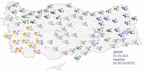 Parçalı ve çok bulutlu, kıyı kesimleri yağmurlu, iç kesimleri aralıklı karla karışık yağmur ve kar yağışlı