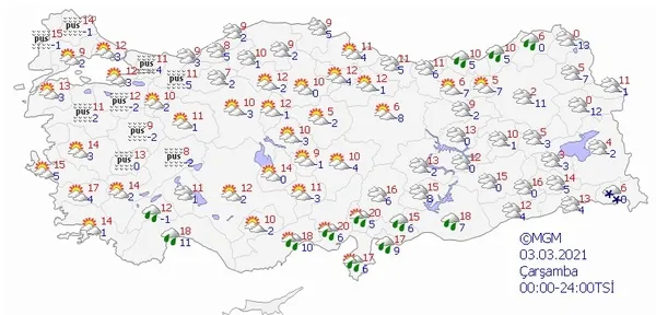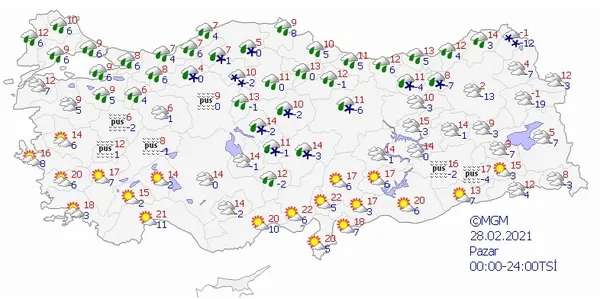 Meteoroloji Genel Müdürlüğü tarafından yapılan son değerlendirmelere göre; Ülkemizin kuzey ve iç kesimlerinin parçalı ve çok bulutlu, Marmara'nın doğusu, Karadeniz Bölge geneli ve Doğu Anadolu'nun kuzeyi ile Çankırı, Yozgat, Sivas, Kayseri, Bingöl, Muş ve Bitlis çevrelerinin yağışlı, diğer yerlerin az bulutlu geçeceği tahmin ediliyor. Yağışların genellikle yağmur, Karadeniz'in iç kesimleri, İç Anadolu'nun kuzeydoğusu ve Doğu Anadolu'nun yağış alan yerlerinde karla karışık yağmur ve kar şeklinde olması bekleniyor. Sabah ve gece saatlerinde iç ve doğu kesimlerde buzlanma ve don olayı ile birlikte yer yer pus ve sis hadisesi bekleniyor. Doğu Karadeniz'in iç kesimleri ile Doğu Anadolu'nun güneydoğusunda yüksek kar örtüsü bulunan kesimlerde çığ oluşma tehlikesi bulunmaktadır. HAVA SICAKLIĞI: Kuzeybatı kesimlerde hissedilir derecede (4 ila 8 derece) azalacağı, diğer yerlerde önemli bir değişiklik olmayacağı tahmin ediliyor. RÜZGAR: Genellikle kuzeyli yönlerden hafif, ara sıra orta kuvvette, Marmara'nın batısı ile Ege kıyılarında kuvvetlice (3050 Km/saat) eseceği tahmin ediliyor. ÇIĞ UYARISI: Doğu Karadeniz'in iç kesimleri ile Doğu Anadolu'nun güneydoğusunda yüksek kar örtüsü bulunan dik yamaçlarda çığ oluşma tehlikesine karşı dikkatli ve tedbirli olunmalıdır. İŞTE TÜRKİYE GENELİ İL İL HAVA DURUMU TAHMİNLERİ 28 ŞUBAT 2021 PAZAR MARMARA EDİRNE °C, 12°C İSTANBUL °C, 9°C KIRKLARELİ °C, 10°C KOCAELİ °C, 8°C EGE A.KARAHİSAR °C, 8°C DENİZLİ °C, 17°C İZMİR °C, 16°C MANİSA °C, 14°C AKDENİZ ADANA °C, 22°C ANTALYA °C, 21°C HATAY °C, 20°C ISPARTA °C, 14°C İÇ ANADOLU ANKARA °C, 9°C ÇANKIRI °C, 10°C ESKİŞEHİR °C, 6°C KONYA °C, 14°C BATI KARADENİZ BOLU °C, 4°C DÜZCE °C, 7°C KASTAMONU °C, 5°C ZONGULDAK °C, 7°C ORTA ve DOĞU KARADENİZ AMASYA °C, 13°C RİZE °C, 12°C SAMSUN °C, 10°C TRABZON °C, 13°C DOĞU ANADOLU ERZİNCAN °C, 10°C ERZURUM °C, 2°C KARS °C, 4°C VAN °C, 5°C GÜNEYDOĞU ANADOLU DİYARBAKIR °C, 16°C GAZİANTEP °C, 17°C SİİRT °C, 15°C ŞANLIURFA °C, 20°C 28 ŞUBAT 2021 PAZAR HAVA DURUMU 1 MART 2021 PAZARTESİ HAVA DURUMU 2 MART 2021 SALI HAVA DURUMU 3 MART 2021 ÇARŞAMBA HAVA DURUMU 4 MART 2021 PERŞEMBE HAVA DURUMU
