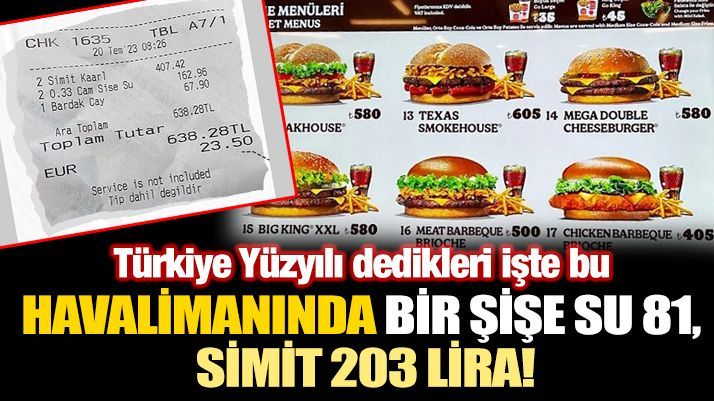 Sabiha Gökçen Havalimanı'nda yapılan bir alışveriş fişine göre simit 203.71 liradan satılıyor. Bir şişe 330 ml. suyun fiyatı 81.48, bir çay ise 67.90 lira. Alışverişi yapan kişi 2 simit, 2 şişe su ve 1 çay için 638 lira 28 kuruş ödemiş oldu. Alışveriş fişi sosyal medyada paylaşıldı, fiyatlar görenleri şaşırttı, çok sayıda tepki aldı. Bazı kişiler bu satış fişini, “Sabiha Gökçen Havalimanı. 2 simit, 2 küçük su, 1 bardak çay toplam 638.28 TL. Uçuyoruz. Avrupa bizi kıskanıyor. Bu fiyat onlarda yok” notuyla paylaştı.