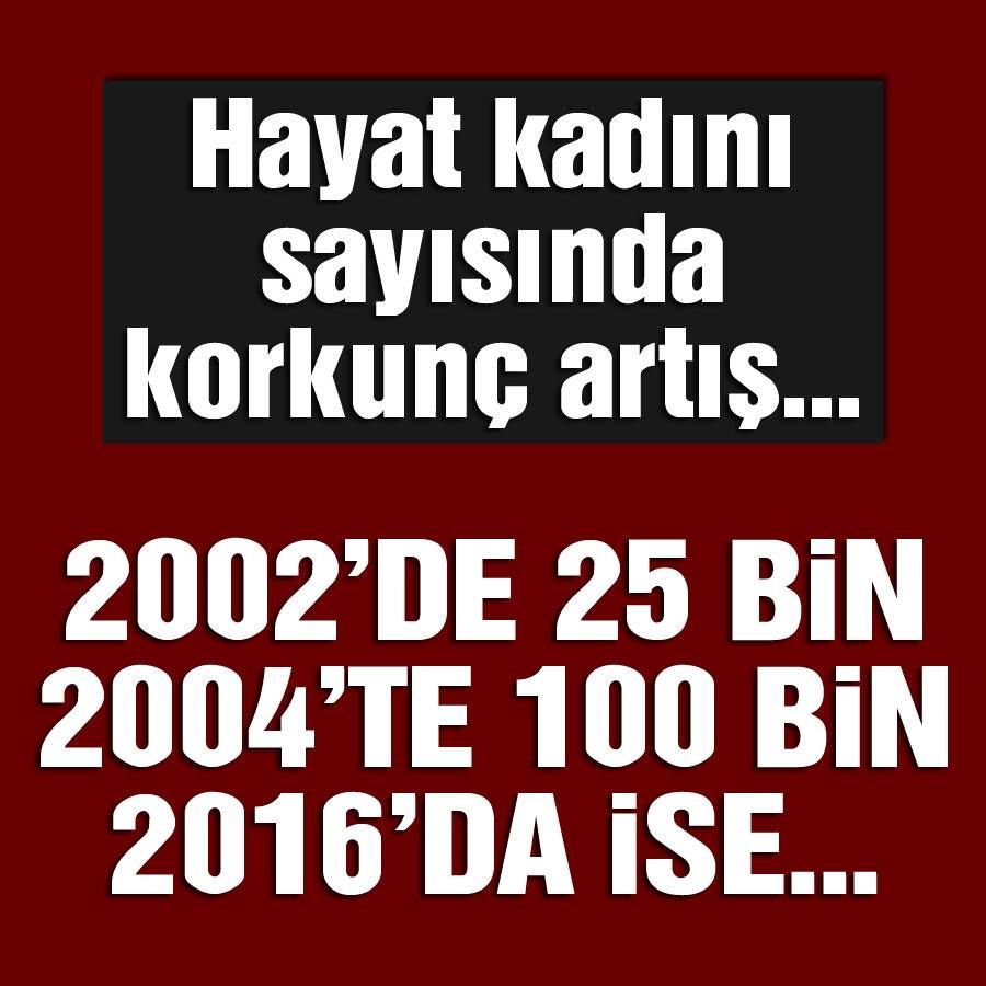 AKP'nin iktidara geldiği 2002'de resmi ve gayriresmi hayat kadını sayısı 25 bin idi. Ankara Ticaret Odası'nın 2004 tarihli raporuna göre, hayat kadını sayısı100 bindi.