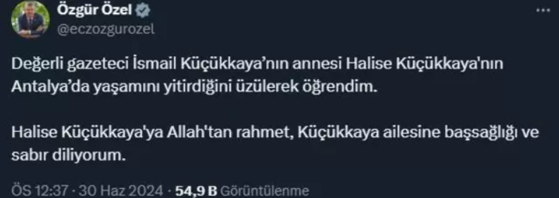 Antalya'da tatil yapan gazeteci İsmail Küçükkaya'nın annesi Halise Küçükkaya, denizde geçirdiği kalp krizi sonucu yaşamını yitirdi. Adli tıbba gelen Küçükkaya'nın oldukça üzgün olduğu ve gözyaşlarını tutamadığı görülürken, CHP lideri Özgür Özel de bir taziye mesajı paylaştı.