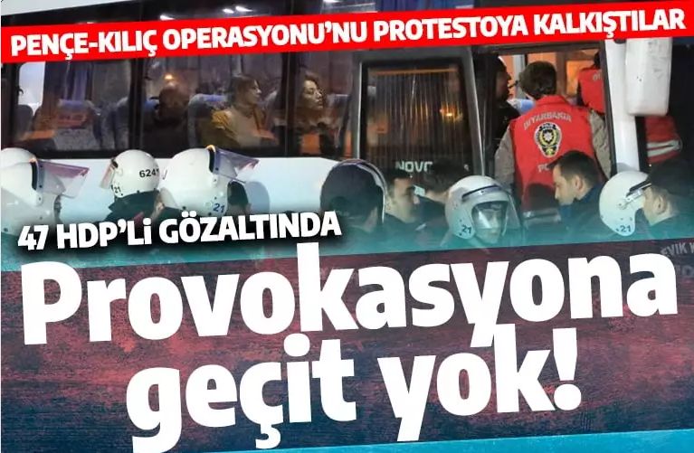 Diyarbakır'da Irak ve Suriye'nin kuzeyindeki terör hedeflerine yönelik yapılan ‘Pençe Kılıç Hava Harekatı HDP'yi rahatsız etti. Operasyonu izinsiz basın açıklaması yaparak protesto etmek isteyen HDP’li gruba, polis müdahale etti, 47 kişi gözaltına alındı.