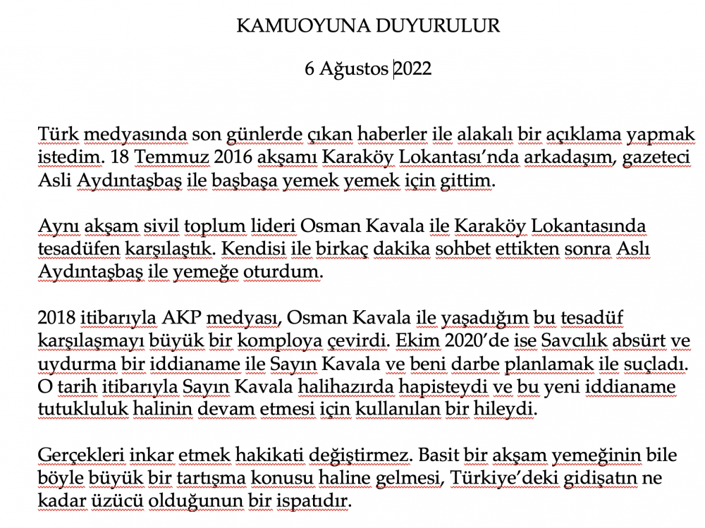 Sevgili Osman arkadaşımdır. Osman Kavala, iddia edildiği gibi bir ABD’li akademisyenle aynı anda lokantada olduğu iddiasıyla cezaevinde değildir. Osman Kavala ve arkadaşları Gezi davasından ceza almıştır. Osman Kavala'yı cezaevinde tutmak için ortaya atılan ikinci bir dava kurgusu, yani casusluk davası, bu kişiyle yemek yediği tezine dayalı değildir. Kaldı ki Osman Kavala, bu davadan beraat etmiştir.15 Temmuz'dan günler sonra farklı şahısların yollarının İstanbul'da aynı lokantada kesişmiş olması, suç değildir. Sır da değildir. İddianame de buna dayanmamaktadır.