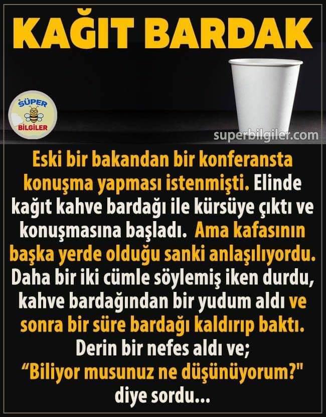 Eski bir bakandan bir konferansta konuşma yapması istenmişti.Elinde kağıt kahve bardağı ile kürsüye çıktı ve konuşmasına başladı. Ama kafasının başka yerde olduğu sanki anlaşılıyordu.Daha bir iki cümle söylemiş iken durdu, kahve bardağından bir yudum aldı ve sonra bir süre bardağı kaldırıp baktı.Derin bir nefes aldı ve;“Biliyor musunuz ne düşünüyorum?” diye sordu,“Bu konferansta geçen yıl da, hem de aynı kürsüde konuşmuştum.Tek bir fark vardı; o zaman hala bakanlık görevim sürüyordu.Buraya gelirken bana business class bileti alınmıştı, hava alanında beni bir limuzin ve eskort araba bekliyordu.Beni önce bir otele götürmüşlerdi.Otel müdürü beni otelin kapısında karşılamış