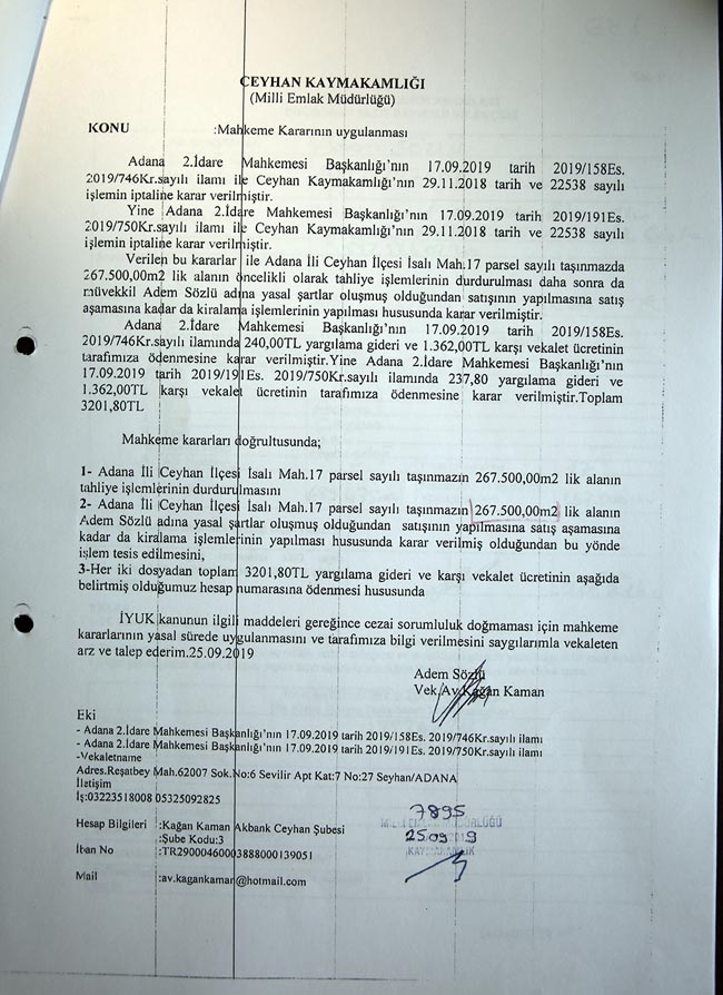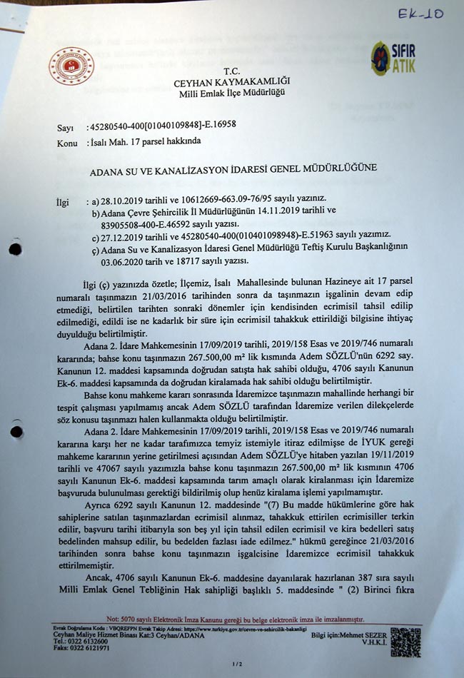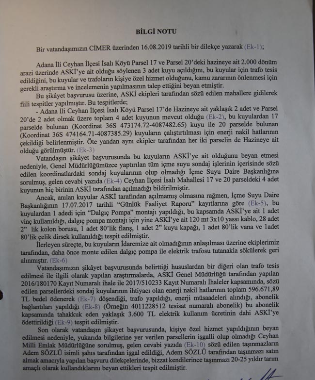 Adana Büyükşehir Belediyesi eski Başkanı Hüseyin Sözlü’nün kardeşi Adem Sözlü’nün 25 yıldır işgal ettiği ve işgalin Ceyhan Milli Emlak Müdürlüğü’nce belgelendirildiği, Ceyhan’ın İsalı Köyü'ndeki 2 bin dönümlük hazine arazisinde, Adana Büyükşehir Belediyesi’nin imkanlarıyla 10 kilometrelik elektrik nakil hattı çekildiği, açılan kuyulara dalgıç pompaları yerleştirildiği, elektrik panoları yaptırıldığı ve elektrik faturalarının da ASKİ’ye ödetildiği belgeleriyle tespit edildi.