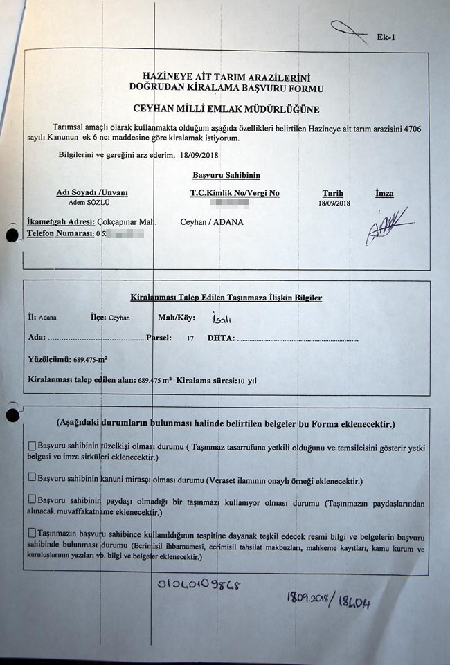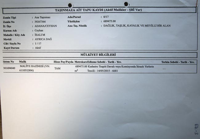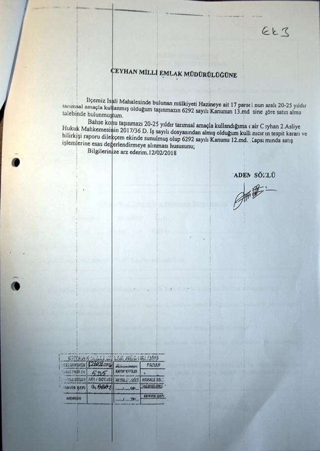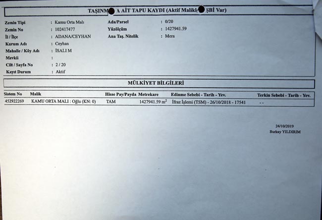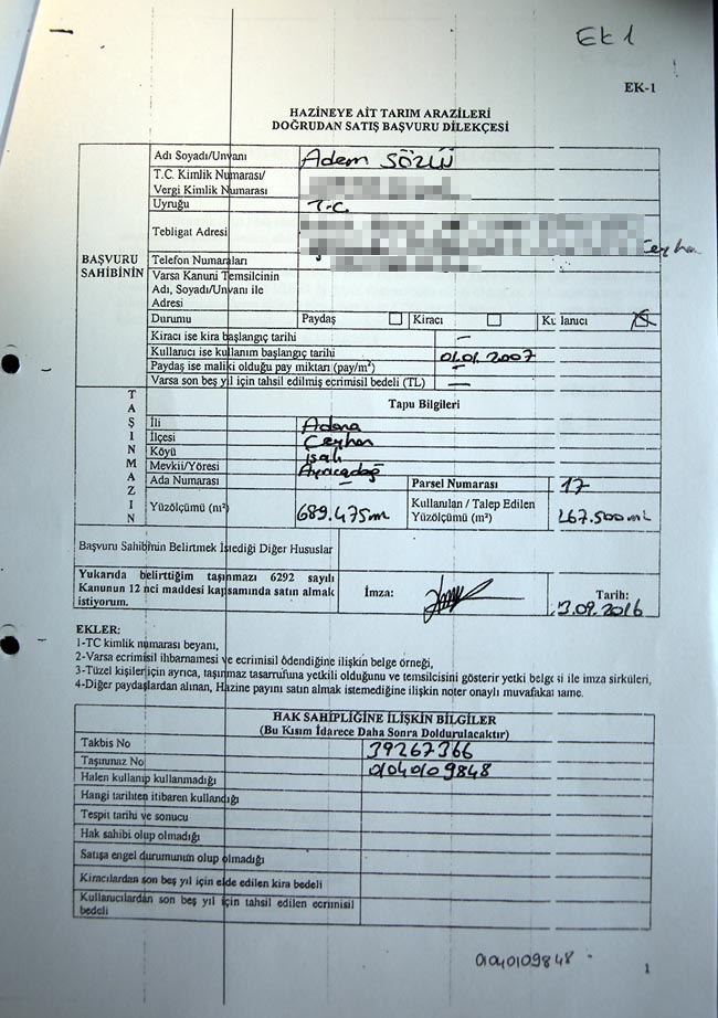 Köylüler, Ceyhan Ovası’na hakim araziye Hüseyin Sözlü’ün defalarca makam aracıyla geldiğini, denetleme yaptığını bildirdi.