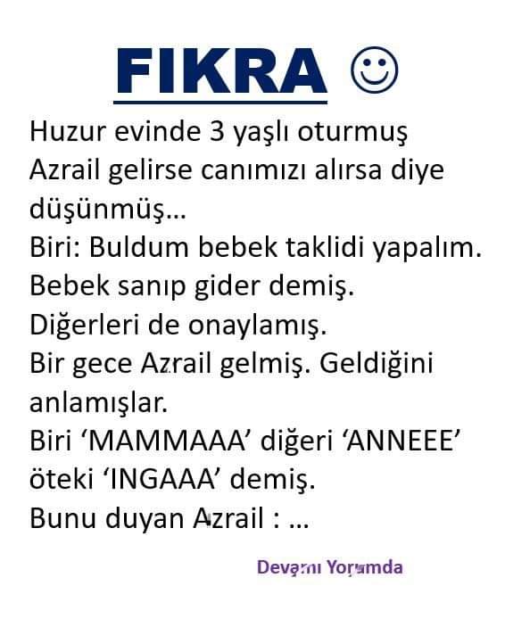 Biri: Buldum bebek taklidi yapalım. Bebek sanıp gider demiş. Diğerleri de onaylamış. Bir gece Azrail gelmiş. Geldiğini anlamışlar. Biri ‘MAMMAAA’ diğeri ‘ANNEEE’ öteki ‘INGAAA’ demiş. Bunu duyan Azrail… DEVAMINI OKUMAK İSTERSENİZ GÖRSELE DOKU’NUNUZ DİĞER SAYFADAN