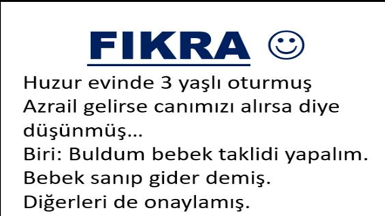 Biri: Buldum bebek taklidi yapalım. Bebek sanıp gider demiş. Diğerleri de onaylamış. Bir gece Azrail gelmiş. Geldiğini anlamışlar. Biri ‘MAMMAAA’ diğeri ‘ANNEEE’ öteki ‘INGAAA’ demiş .Bunu duyan Azrail… Devamını Okumak İçin..Ayrıntılar diğer sayfada haberimiz detayındadır..HABERİN DEVAMINI OKUMAK İÇİN FOTOĞRAF ÜZERİNDEN DİĞER SAYFAYA GEÇİŞ YAPINIZ