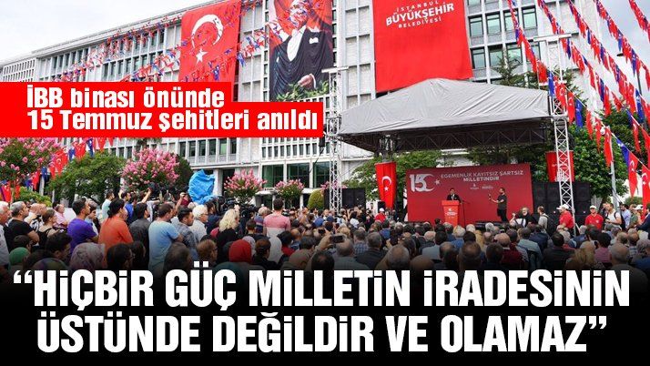 İBB’nin Saraçhane’deki binasının önündeki anma töreni, saygı duruşu ve İstiklal Marşı’nın okunmasıyla başladı. Daha sonra konuşma yapan İmamoğlu, “Gerçekten 15 Temmuz demokrasimize ve milli birliğimize sıkıca sarılma, millet iradesini yok saymanın her türlüsüne karşı koymak kararlılığımızı yüksek sesle hem de en üst iradeyle ilan etme günüdür” dedi.